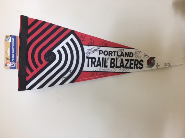 Package includes 4 Tickets to the Blazer game against the Houston Rockets at 7:00 PM on December 9, 2017. Tickets are in Section 111, Row L, Seats 7-10. Package also includes a signed Portland Trail Blazer Pennant.